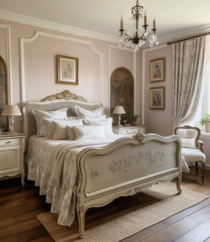 The elegant French farmhouse somehow injects a bit of sophistication into rustic charm. Consider soft pastel wall paint colors, toile fabrics, carved wood furniture, and vintage mirrors. I adored the refined antique-top-old-exposed-beams blend when staying in a French country inn and came away inspired. Use linen curtains, wrought iron accents, chandeliers, and delicate wall decor. Pairing with soft white and muted lavender or sage.