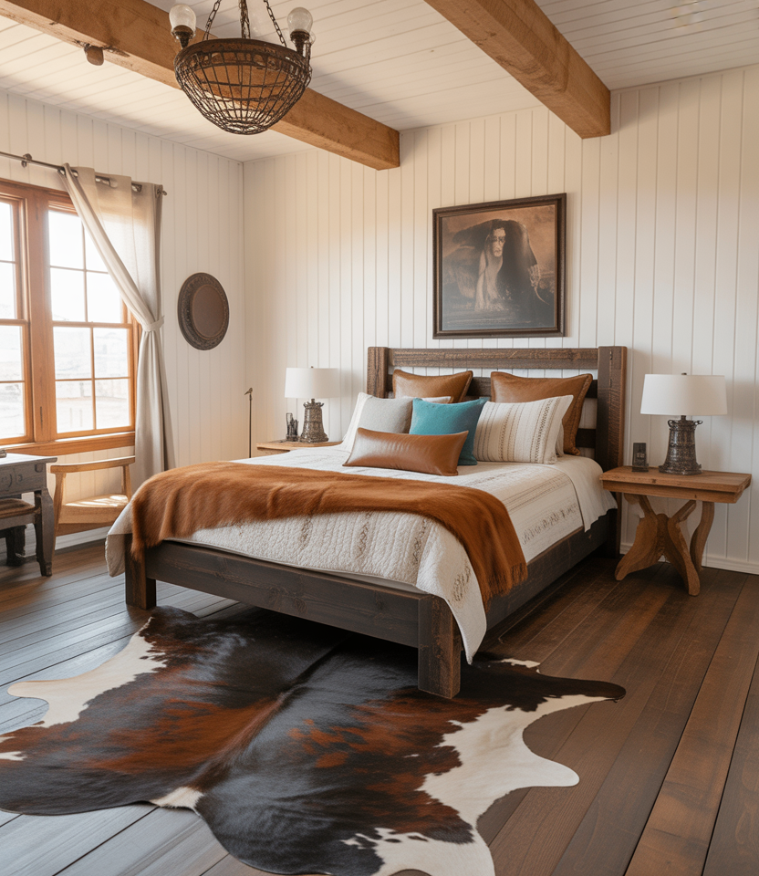 The Western ranch vibe feels well grounded with leather, cowhide rugs, turquoise accents, and raw timber. This design concept radiates rugged appeal and personality. I once visited a countryside lodge where these details made the room feel authentic and grounded. Go for a heavy wood or metal bed, Navajo print blankets, rustic dresser, and antler hooks or wrought iron wall decor with neutral creams and sand tones.