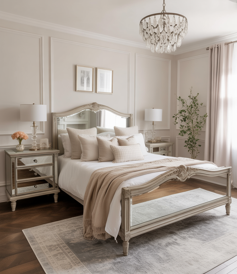 Introduce subtle glamour into the rustic philosophy-crystal or glass bedside lamps, mirrored furniture, and chic throws. This decor idea marries rustic and elegant. I once staged a guest room with a mirrored dresser and barn doors; it looked refined but still down-to-earth. Use pale neutral colors, beveled mirrors, soft metallic accents, and farmhouse wood textures.