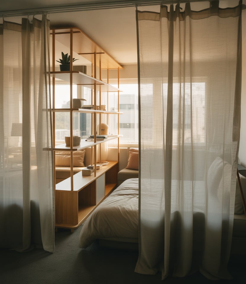 Creating definition in a studio apartment is key to making it feel livable, especially when sleeping, working, and relaxing all happen in one room. Light visual dividers like open shelving, curtains, or folding screens offer structure without blocking light. This approach supports small space organization ideas while keeping the layout flexible and renter-safe.