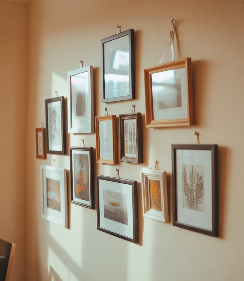 Gallery walls remain popular in rent-friendly decor ideas because they instantly personalize rented apartments. Lightweight frames, removable hooks, and leaning art create visual interest without damage. Mixing photography, illustrations, and thrifted art keeps the wall expressive while staying budget-conscious.