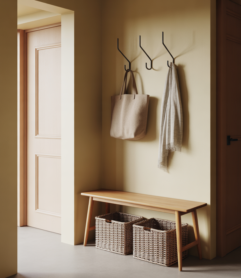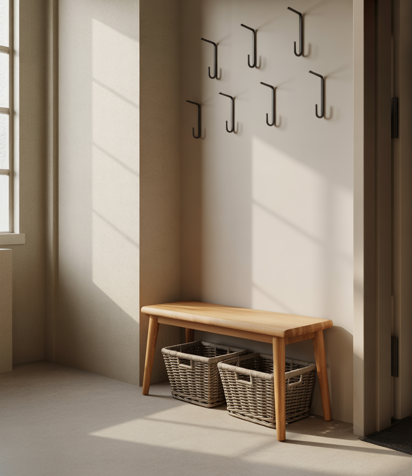 Even small apartments benefit from a defined entry moment. A minimalist setup using a slim bench, hooks, and baskets supports daily routines without clutter. In busy households or shared spaces, this simple system keeps shoes, bags, and keys contained and visually calm.