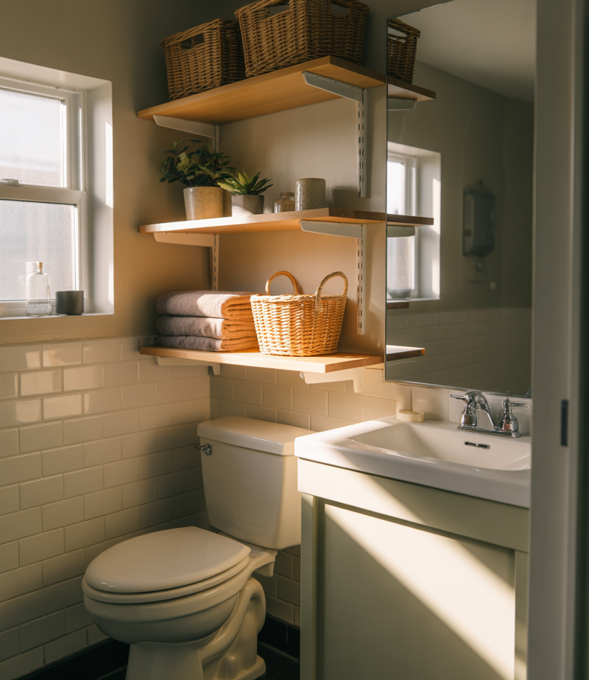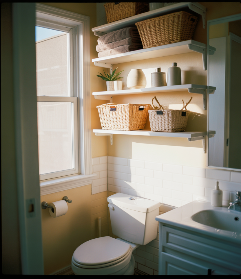 Rental bathrooms benefit from smart add-ons that don’t alter walls. Over-the-toilet shelving and baskets support small space organization ideas while keeping the bathroom calm and functional. Choosing cohesive materials elevates the look beyond basic utility.