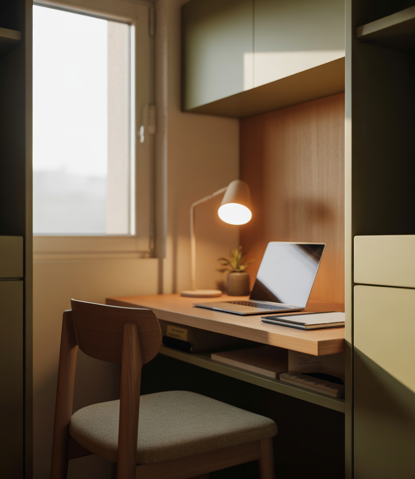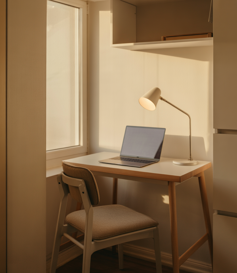 As remote work stays common, a compact desk area has become essential in rented apartments. A clean-lined table, slim chair, and soft lighting create a minimalist workspace that blends into the room instead of taking it over. This setup works especially well in bedrooms or living rooms where flexibility matters and permanent changes aren’t allowed.