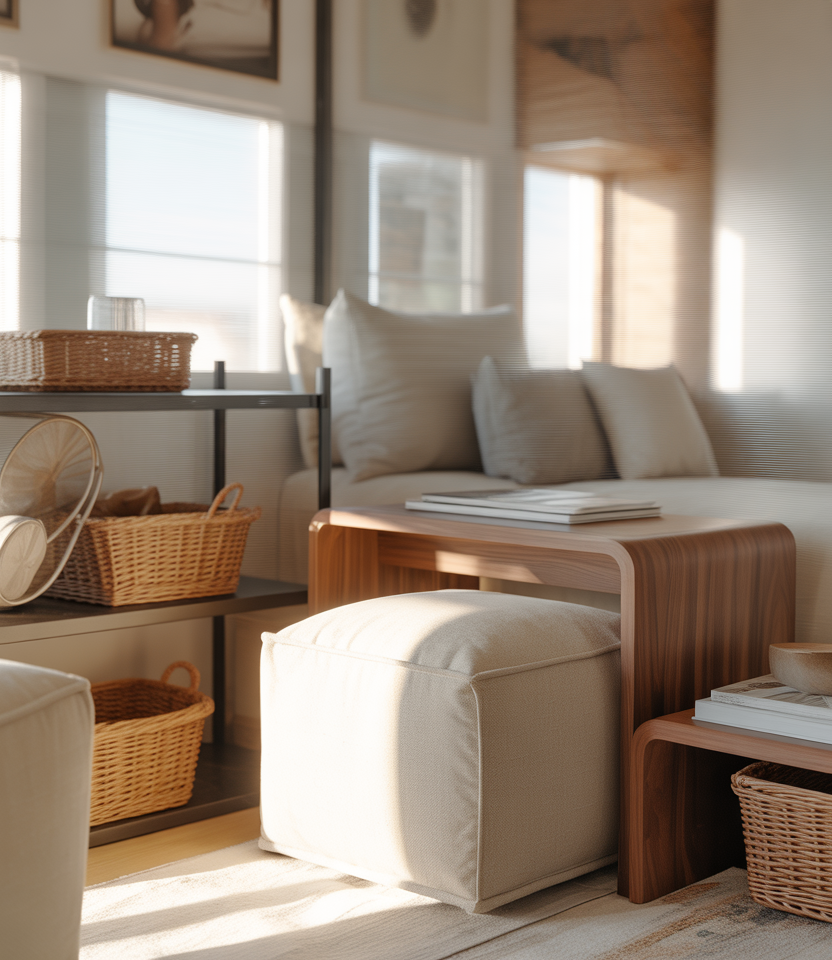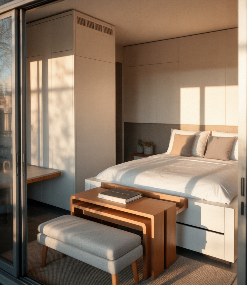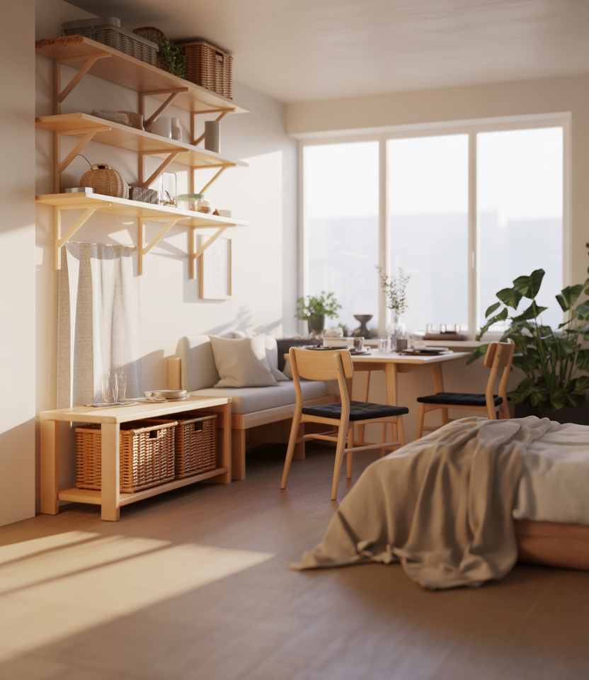 In a small studio, furniture must earn its place. Beds with drawers, benches with storage, and nesting tables offer creative storage solutions while keeping floors clear. This approach supports daily living without overwhelming limited square footage.