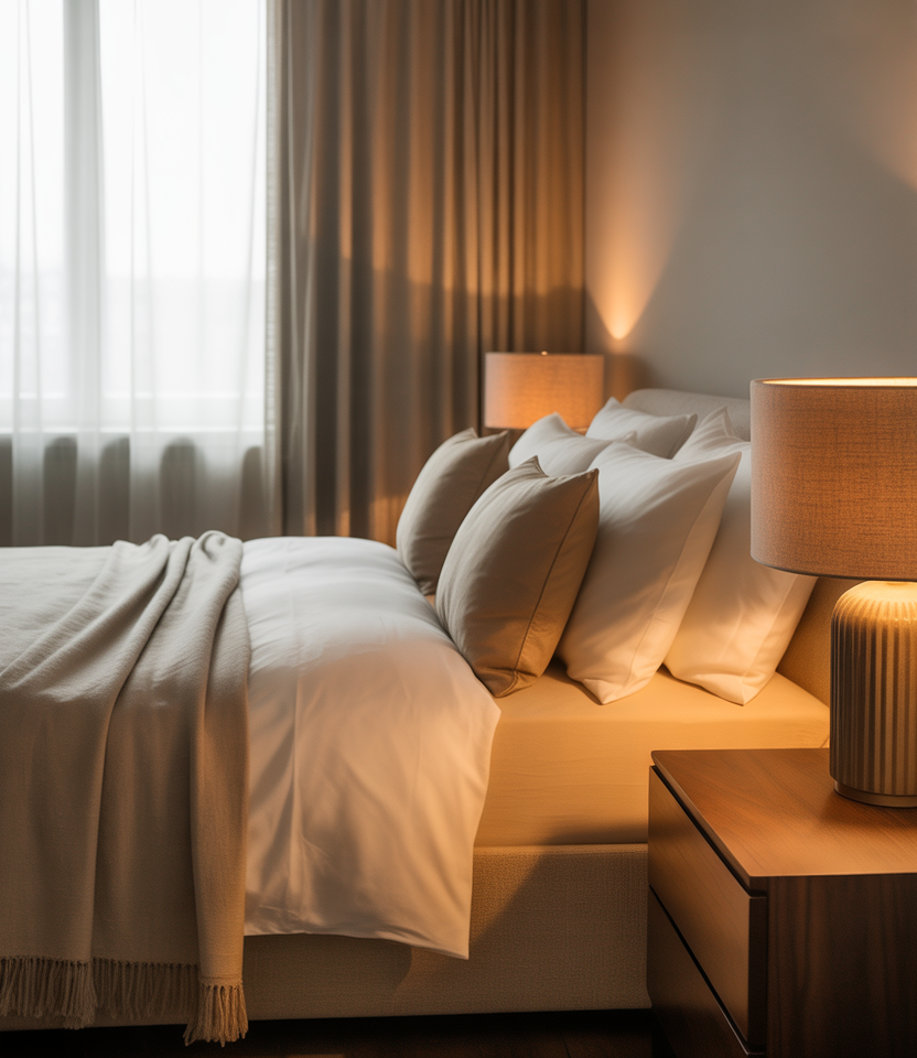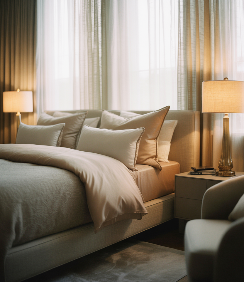 Subtle upgrades can introduce a sense of luxury without exceeding a budget. Layered curtains, quality bedding, and warm lamps elevate a modern apartment while remaining renter-safe. These details focus on comfort and atmosphere rather than expensive materials.