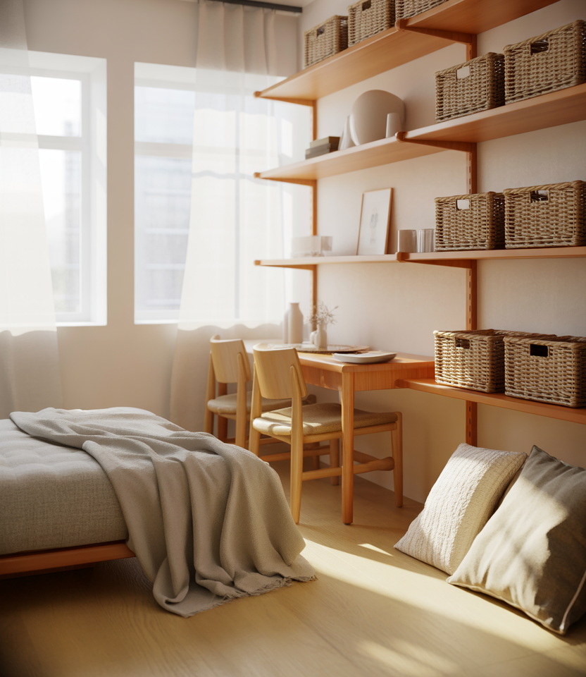 This idea blends Scandinavian-inspired calm with small space organization ideas that feel light, not utilitarian. Pale wood shelves, soft baskets, and clean lines help a small studio stay visually open while still holding everyday items. Everything looks intentional, even when storage is doing the heavy lifting.