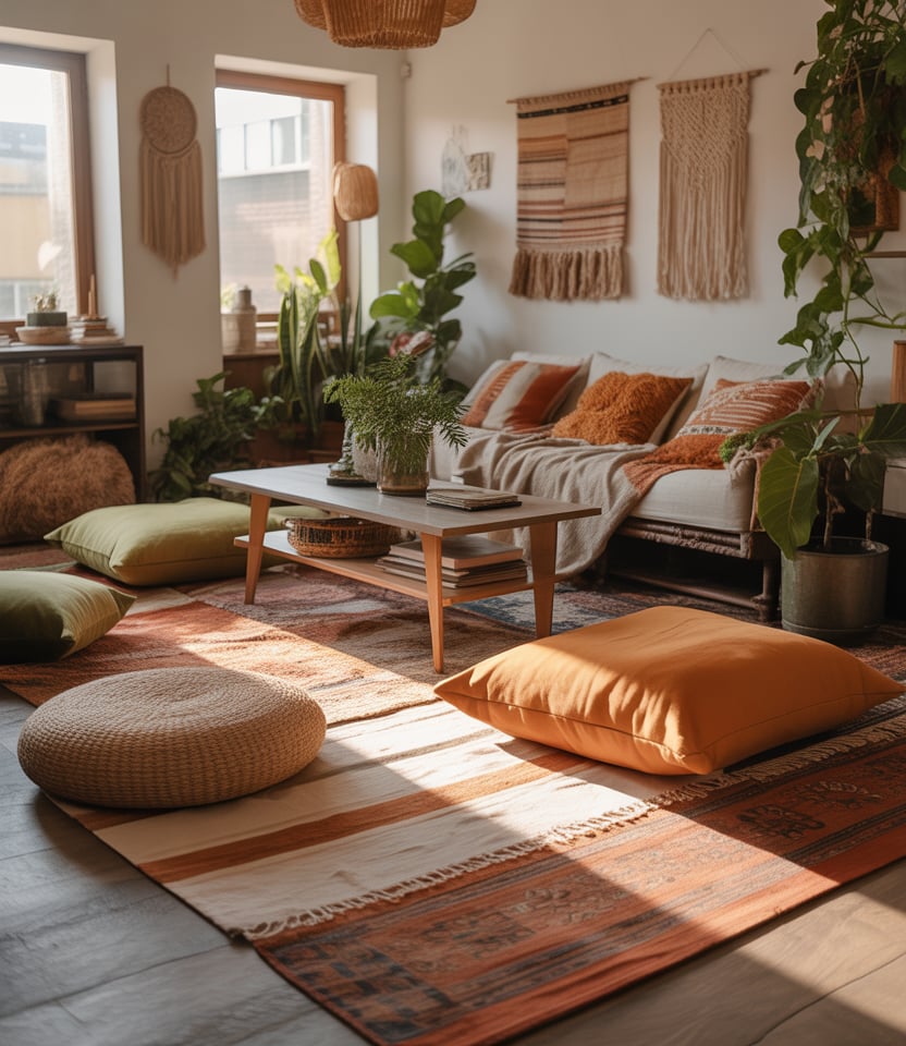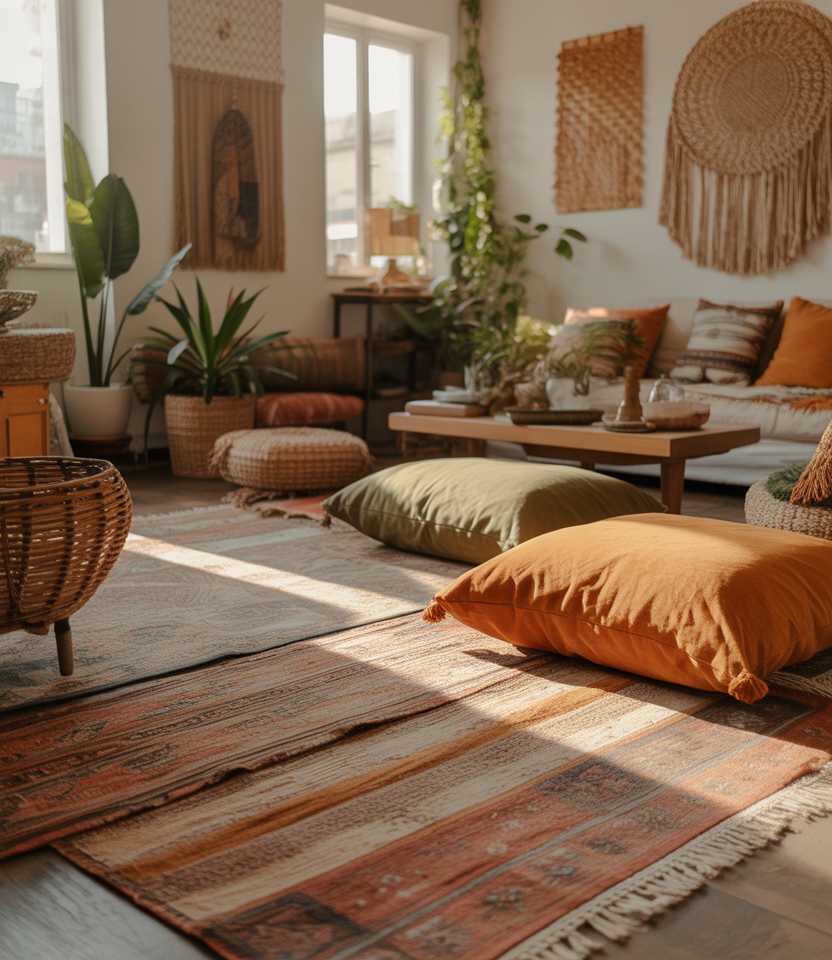 A relaxed boho look works beautifully in rent-friendly decor ideas when texture does the storytelling. Think woven wall hangings, layered rugs, and low seating that can shift with the space. This style adds warmth without drilling, painting, or altering surfaces, making it ideal for renters craving personality.