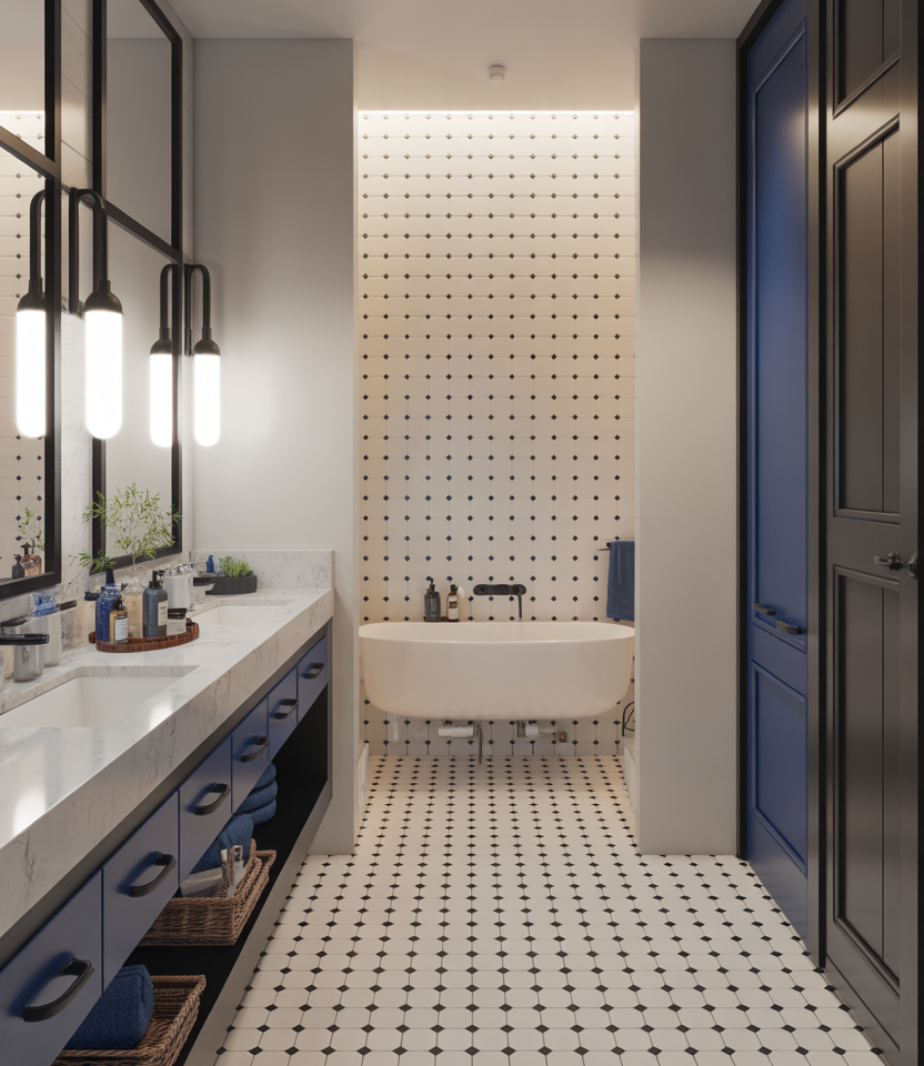 Monochrome luxury gives the bathroom a sophisticated, gallery-like presence. Employ high-contrast surfaces like charcoal tiles, crisp white grout, or veined marble for drama. Touches of black and white geometry, a slim hint of luxurious finish, and one deliberate Chanel-inspired accent create a clear visual identity. Real homeowner behavior demonstrates that people like to add in little pops of color over time, like a warm wood stool or soft green plant. This prevents the palette from being too stark and provides an avenue for seasonal adjustments that don’t feel like deviating from the core elegance.
