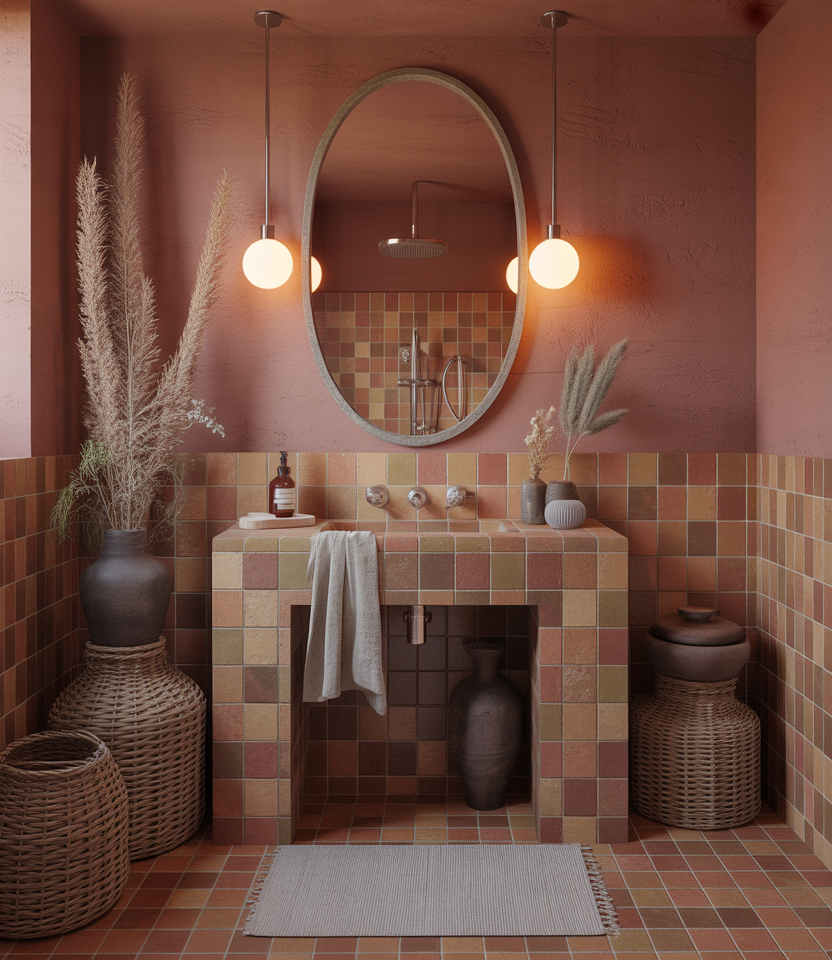 A terracotta-forward bathroom brings warmth and grounding color to even the simplest layouts. Pair clay-toned tiles with woven baskets and soft towels for a lived-in but thoughtful look. A touch of colorful vibrancy, a hint of rustic texture, and a sliver of silver hardware keep the palette balanced and modern without overwhelming the senses. Practical insight: terracotta thrives in rooms with steady ventilation because porous surfaces appreciate airflow. If you have a naturally breezy window or strong fan, the material stays looking fresh and dries quickly after showers, making it easier to maintain long-term.