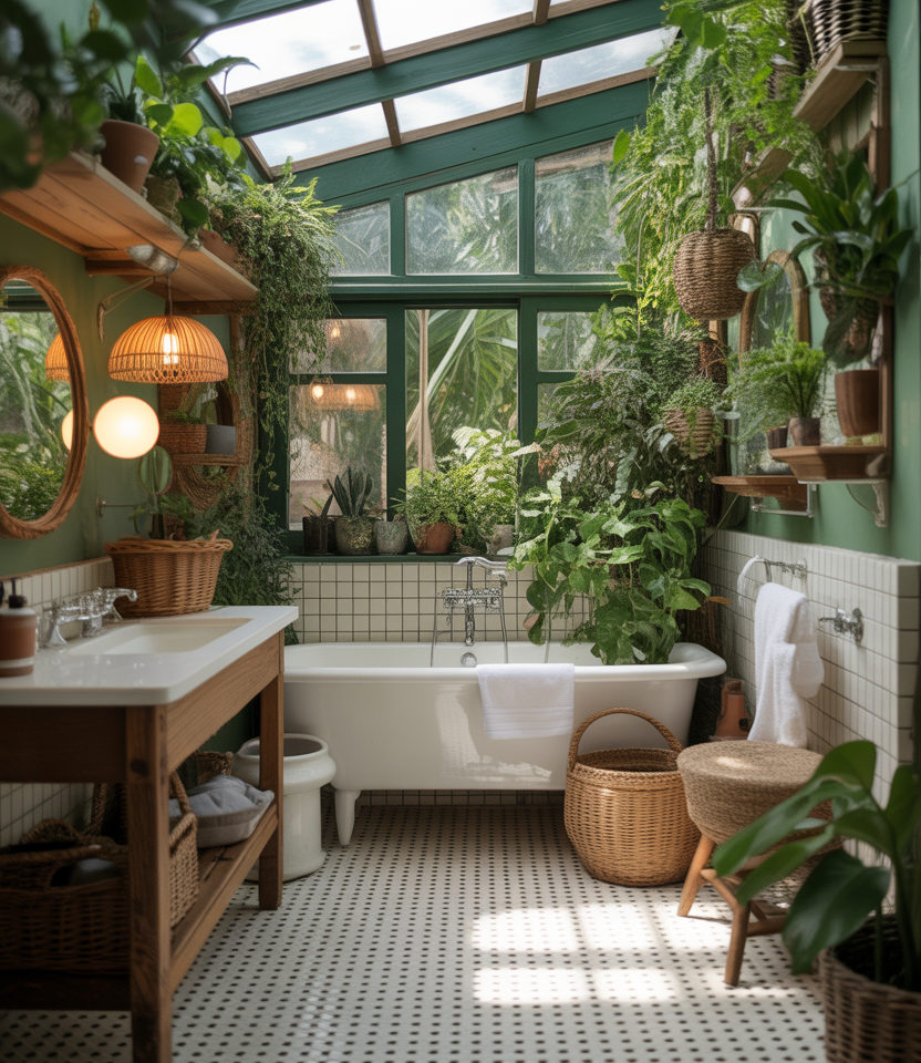 This idea transforms the bathroom into a micro-greenhouse with lush foliage and plants that love moisture. The bright walls go well with natural baskets and stoneware pots. More subdued green highlights give a hint of spring freshness, while organic greenery touches keep the space alive and rejuvenating. Real homeowner behavior shows many start with one plant—often a pothos or fern—and then grow a collection after seeing how well they thrive in the humid air. The bathroom becomes part-washroom and part-mini-jungle, effortlessly energizing one through the morning.