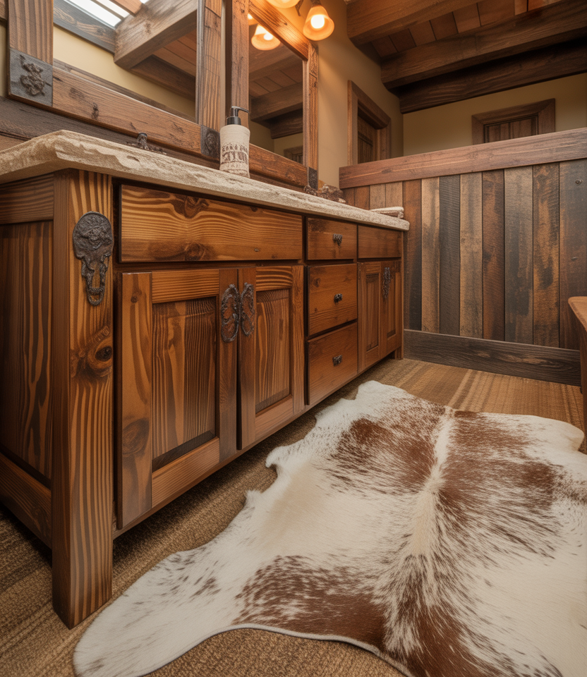 For a modern frontier mood, a Western timber blend uses knotty woods, warm metals, and sand-tone surfaces. Pair cabinetry with aged brass or blackened iron for contrast. A note of Western charm, delicate rustic accents, and subtle cow patterning keep the vibe grounded without going full ranch-style. One micro anecdote: a couple renovating a mountain cabin discovered that swapping their glossy vanity for a matte timber piece instantly softened the room. The natural variation in the grain brought warmth the moment they stepped inside.