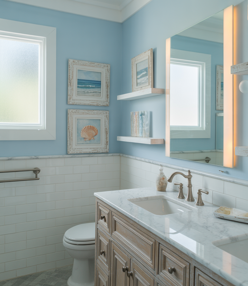 Soft blue tones, set against pale wood and brushed metals, evoke a sophisticated yet soothing guest retreat. Layer in fluffy towels, coastal artwork, and laid-back accessories. A gentle dash of Guest hospitality, muted blue notes, and a breath of spring freshness keep the palette light and breezy. “Where it works best” is in homes with an extra bathroom near the hallway or guest room. The airy palette feels universally appealing, making visitors feel at ease regardless of the season or region.