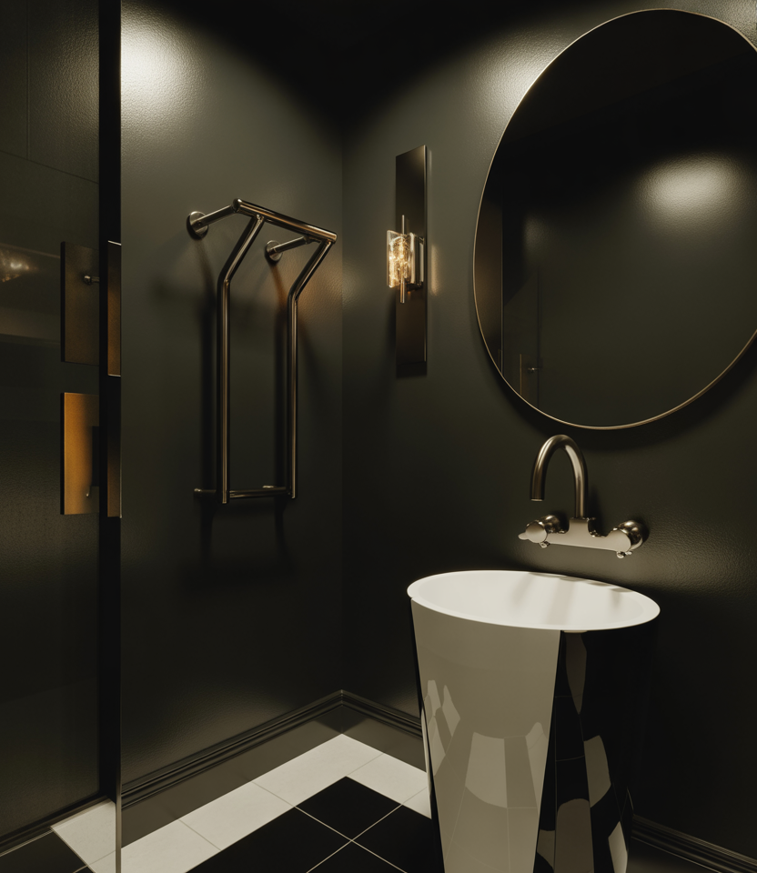 A chic noir powder room brings in drama through rich walls, metallic accents, and sculptural fixtures. Pair deep neutrals with reflective surfaces for a cinematic effect. One splash of Black elegance, a stroke of Black and white contrast, and a hint of luxurious glow define the mood without weighing the room down. One homeowner painted their tiny powder room charcoal, and they found that the depth of the color made people constantly comment on the space. The dramatic palette transformed a small room into a memorable design moment.
