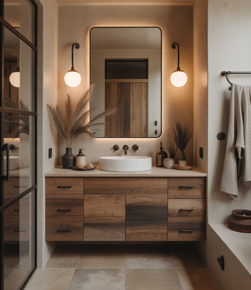 A modern Western aesthetic balances clean geometry with earthy materials, making it ideal for anyone seeking a look that’s both grounded and contemporary. Think sandy palettes, worn woods, and matte metals. Touches of texture, subtle rustic charm, and a quiet black detail or two give it a tailored and lived-in feel. One practical insight: maintain the usage of only two main tones of wood to avoid clutter. The style relies organically on variation, so it will make the bathroom cohesive by reducing the palette. The simplest Shaker-style cabinet or brass hooks can reinforce this Western nod without delving into theme territory.