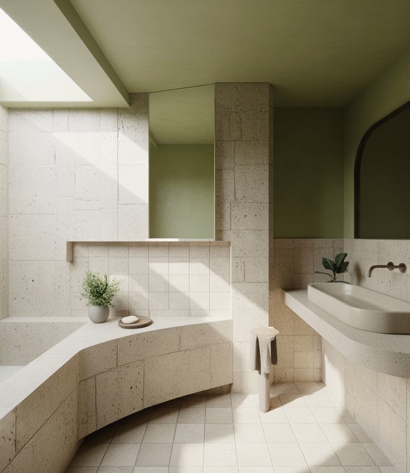 This peaceful bathroom takes its cue from minerals—pale stone, softened edges, and a hush of light that’s instantly soothing. Pair subtle grout tones with matte finishes to amplify the calm. Spa-inspired detailing, organic charm, and green palette nods all work to keep the space earthy without veering into monotony. Little things—a natural fiber stool or a bowl full of river pebbles—elevate the quiet look. Where it really works: when steady natural light in a bathroom can allow the muted tones to shine. These soft gradations also extend the sense of roominess in even compact layouts without relying on glare-inducing white surfaces.