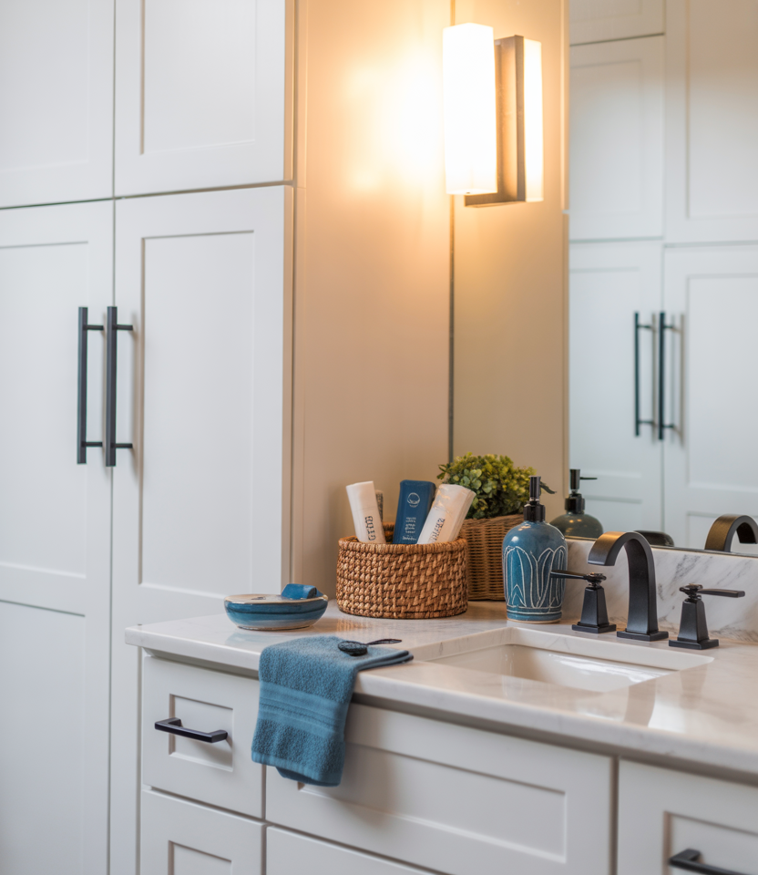 A polished guest bathroom sets the tone for hospitality. Crisp surfaces, thoughtfully chosen accessories, and calming scents go a long way. Gentle guest comforts, a hint of black hardware for structure, and a soft blue or sandy accent create a welcoming, collected feel for overnight visitors. One American lifestyle detail: many hosts keep a small “guest basket” with travel-size toiletries, a fresh hand towel, and a scented candle. This simple gesture signals warmth and turns even a modest space into a memorable retreat for friends and family.