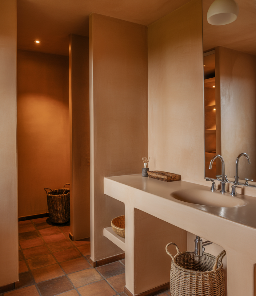 A terracotta-forward bathroom brings warmth and grounding color to even the simplest layouts. Pair clay-toned tiles with woven baskets and soft towels for a lived-in but thoughtful look. A touch of colorful vibrancy, a hint of rustic texture, and a sliver of silver hardware keep the palette balanced and modern without overwhelming the senses. Practical insight: terracotta thrives in rooms with steady ventilation because porous surfaces appreciate airflow. If you have a naturally breezy window or strong fan, the material stays looking fresh and dries quickly after showers, making it easier to maintain long-term.