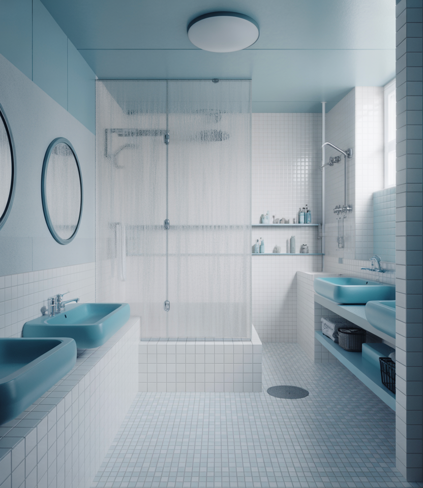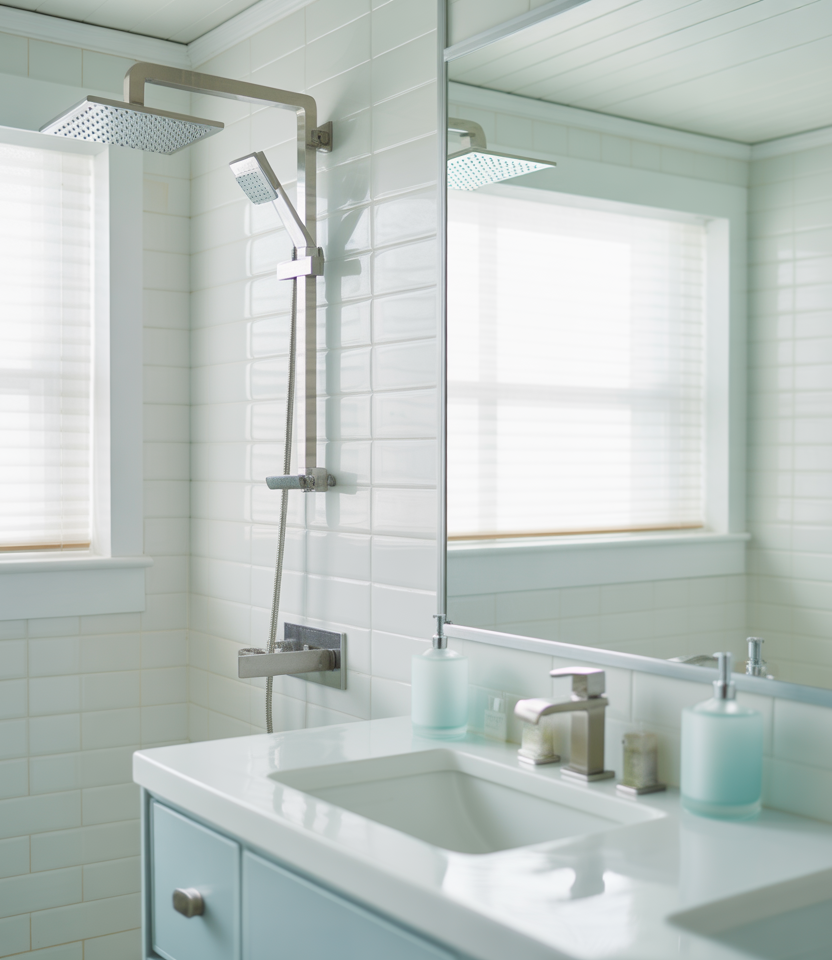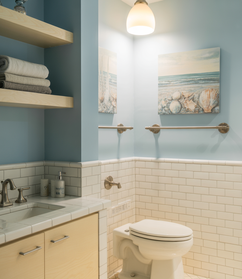 Soft blue tones, set against pale wood and brushed metals, evoke a sophisticated yet soothing guest retreat. Layer in fluffy towels, coastal artwork, and laid-back accessories. A gentle dash of Guest hospitality, muted blue notes, and a breath of spring freshness keep the palette light and breezy. “Where it works best” is in homes with an extra bathroom near the hallway or guest room. The airy palette feels universally appealing, making visitors feel at ease regardless of the season or region.