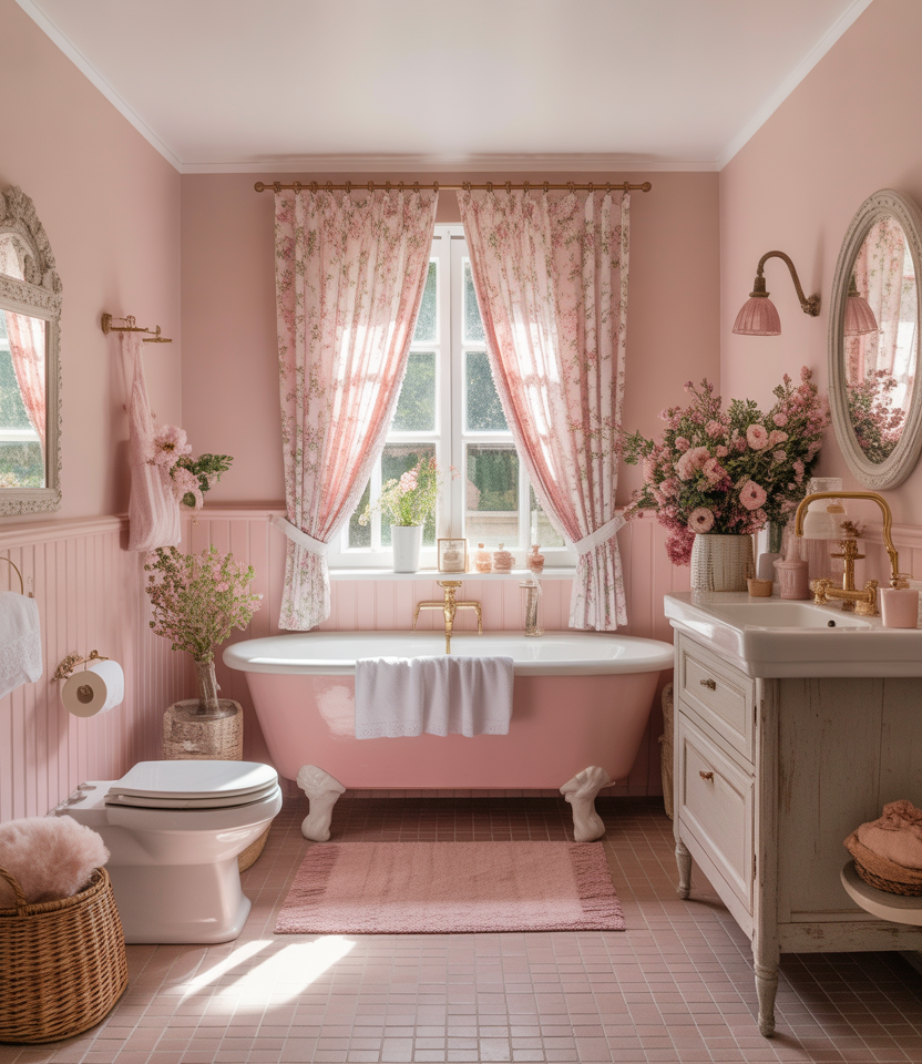 Soft blush hues paired with natural fibers can evoke an airy cottage atmosphere, even in suburban homes. Mix painted millwork with floral curtains for gentle charm. Touches of pink, a little adorable decor, and light bohemian textures bring personality to the otherwise simple palette. Expert-style commentary: keep blush tones muted rather than overly saturated. Soft, dusty hues age well and avoid feeling overly youthful, making them ideal for bathrooms that need long-term staying power while still feeling cheerful.
