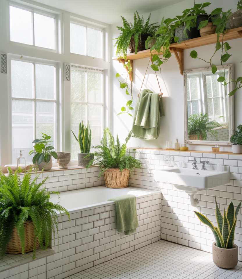 This idea transforms the bathroom into a micro-greenhouse with lush foliage and plants that love moisture. The bright walls go well with natural baskets and stoneware pots. More subdued green highlights give a hint of spring freshness, while organic greenery touches keep the space alive and rejuvenating. Real homeowner behavior shows many start with one plant—often a pothos or fern—and then grow a collection after seeing how well they thrive in the humid air. The bathroom becomes part-washroom and part-mini-jungle, effortlessly energizing one through the morning.