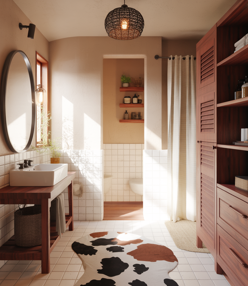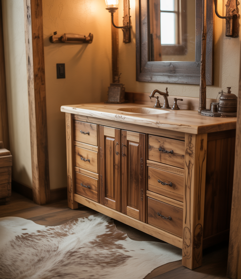 For a modern frontier mood, a Western timber blend uses knotty woods, warm metals, and sand-tone surfaces. Pair cabinetry with aged brass or blackened iron for contrast. A note of Western charm, delicate rustic accents, and subtle cow patterning keep the vibe grounded without going full ranch-style. One micro anecdote: a couple renovating a mountain cabin discovered that swapping their glossy vanity for a matte timber piece instantly softened the room. The natural variation in the grain brought warmth the moment they stepped inside.
