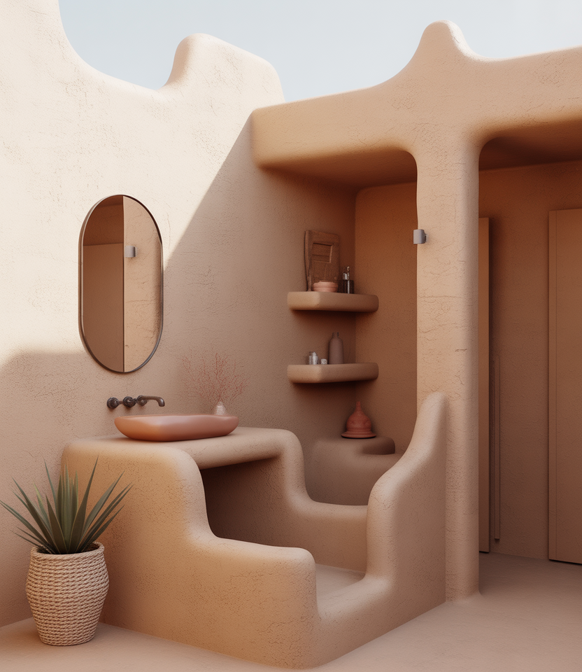 A desert clay palette mixes soft tans, muted oranges, and warm whites for a gentle, sun-washed feeling. Handcrafted ceramics pair beautifully with textured walls. Subtle half-bath layering, a touch of Bohemian earthiness, and warm, colorful terracotta accents bring the idea together effortlessly. Budget/price angle: Clay-inspired décor doesn’t have to be expensive. Painted walls in adobe-like colors and a few handcrafted accessories can mimic high-end finishes without major renovation. This approach makes it a favorite among renters who want impact on a budget.