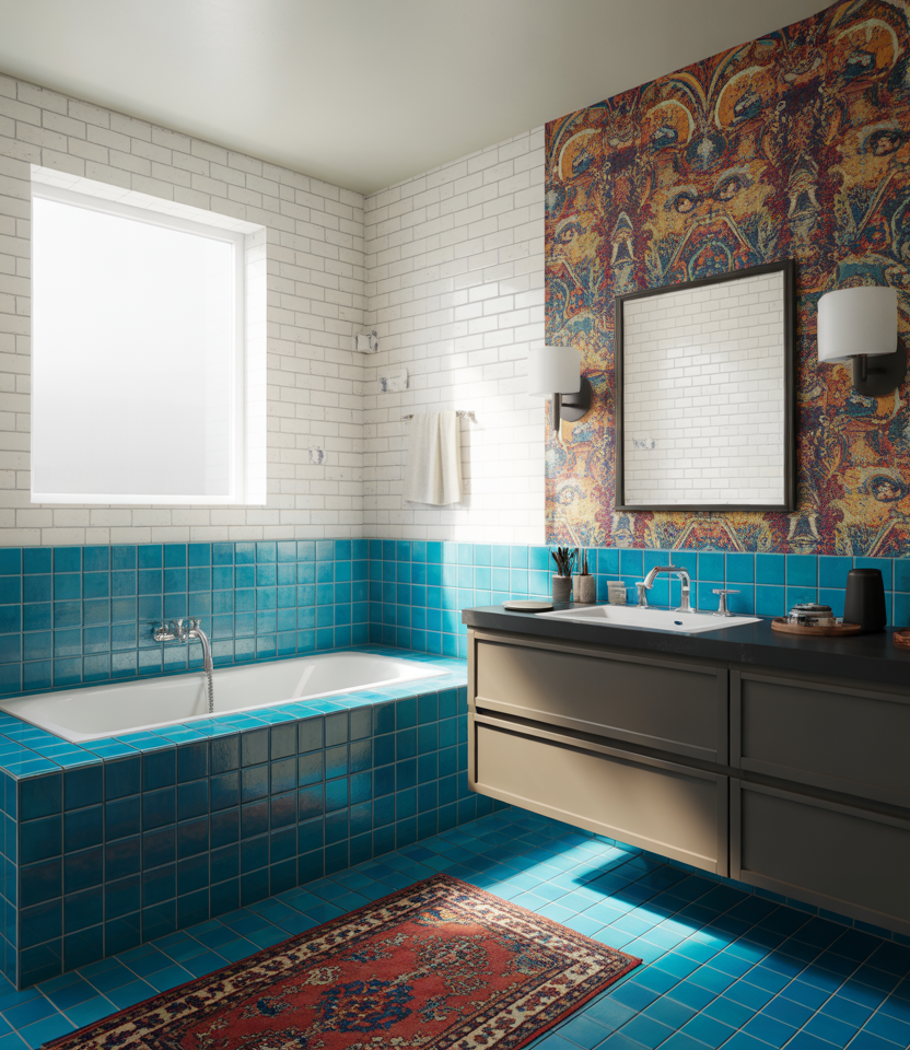 For those with a penchant for visual play, an eclectic pattern mix brings an unexpected layer to the bathroom. Pair the more subdued tile with a playful shower curtain or vintage-style rug to achieve the perfect pitch. Threads of eclectic flair, a touch of Bohemian warmth, and subtle blue accents forge a rich blend without jarring the eye. According to experts, the secret lies in proportion; let one major pattern take the lead, then smaller motifs support it. This keeps the room balanced—even when mixing decades or styles. One bold wallpaper wall with the more sedate floors creates a space that feels curated, not chaotic.