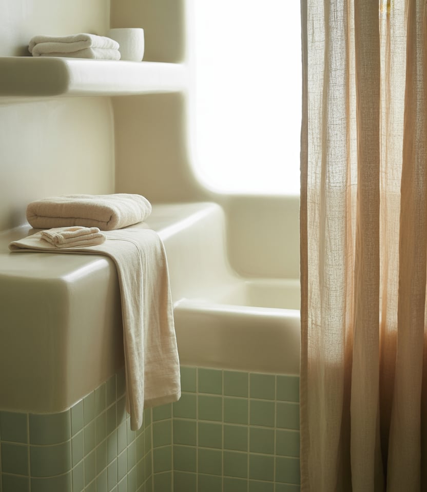 Soft linen minimalism leans into creamy palettes, breezy textures, and gentle curves to create a bathroom that feels effortless and calm. Pair pale walls with matte fixtures and airy textiles for a light, collected look. A whisper of organic texture, a hint of green softness, and a touch of aesthetic restraint keep the space serene and modern. Practical insight: linen towels dry faster than denser cotton options, making them ideal for humid bathrooms. Their natural texture also adds visual warmth without needing bright color, helping small or dimly lit spaces feel more thoughtfully designed.