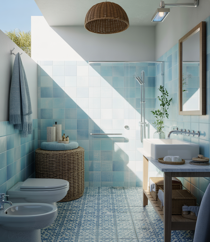 A coastal eclectic bathroom blends breezy seaside tones with unexpected textures. Mix woven elements, patterned tile, and soft color transitions for a lived-in coastal mood. A splash of eclectic personality, a breath of blue, and a pinch of colorful accenting keep the look vibrant yet relaxed. American lifestyle contexts—especially in beach towns—favor decor that stands up to humidity. Choosing mildew-resistant fabrics and rustproof hardware ensures this eclectic mix doesn’t sacrifice durability, especially in homes exposed to sea air.