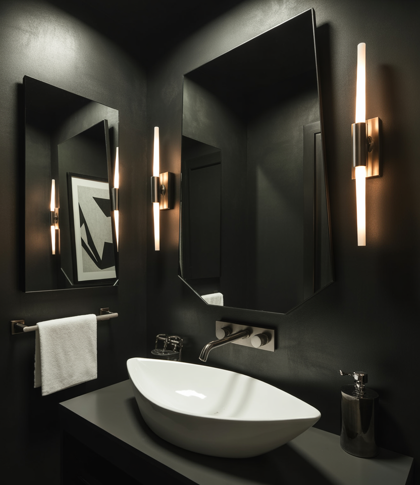 A chic noir powder room brings in drama through rich walls, metallic accents, and sculptural fixtures. Pair deep neutrals with reflective surfaces for a cinematic effect. One splash of Black elegance, a stroke of Black and white contrast, and a hint of luxurious glow define the mood without weighing the room down. One homeowner painted their tiny powder room charcoal, and they found that the depth of the color made people constantly comment on the space. The dramatic palette transformed a small room into a memorable design moment.