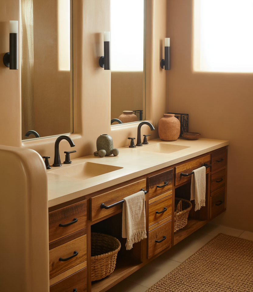 A modern Western aesthetic balances clean geometry with earthy materials, making it ideal for anyone seeking a look that’s both grounded and contemporary. Think sandy palettes, worn woods, and matte metals. Touches of texture, subtle rustic charm, and a quiet black detail or two give it a tailored and lived-in feel. One practical insight: maintain the usage of only two main tones of wood to avoid clutter. The style relies organically on variation, so it will make the bathroom cohesive by reducing the palette. The simplest Shaker-style cabinet or brass hooks can reinforce this Western nod without delving into theme territory.
