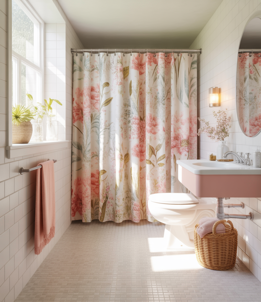 Bright and uplifting, a spring botanical bathroom blends gentle floral motifs with crisp neutrals for a refreshing seasonal feel. Light wood, fluttery prints, and breezy fabrics set the tone. Soft spring hues, pink accents, and a touch of charm help the space feel light without appearing overly youthful. A budget angle works beautifully here: swap in affordable botanical art, patterned towels, or a pastel rug to shift the atmosphere without major renovation. These quick accents allow the bathroom to “bloom” seasonally, making it a playful and flexible approach for renters.