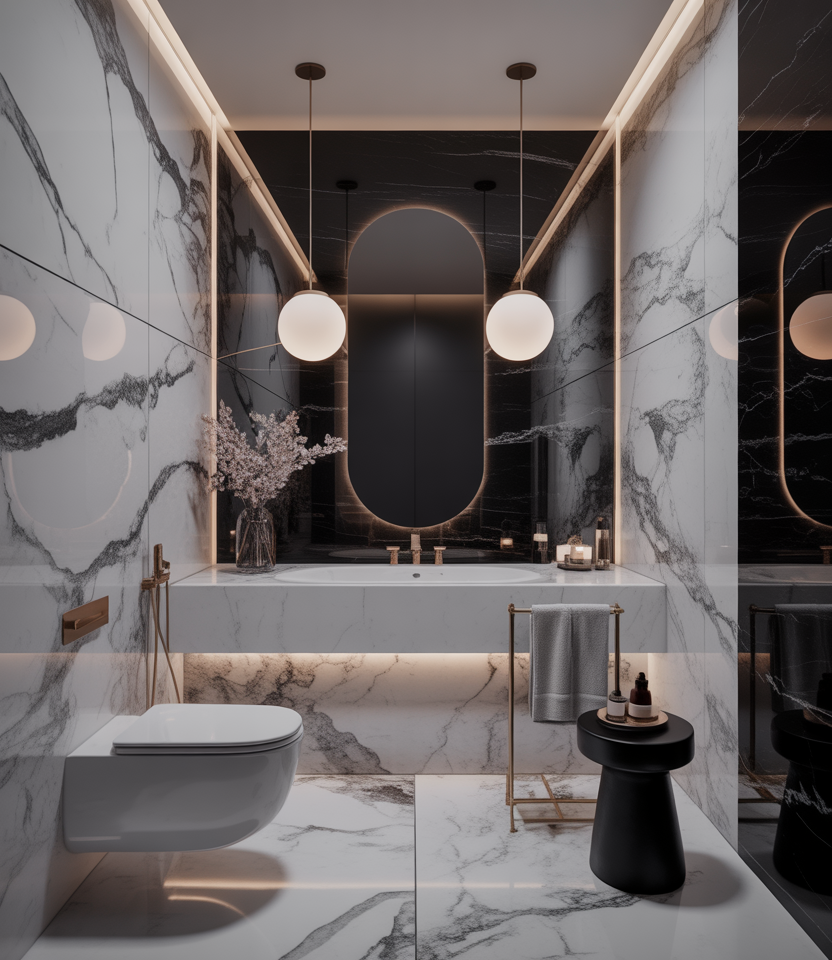 Monochrome luxury gives the bathroom a sophisticated, gallery-like presence. Employ high-contrast surfaces like charcoal tiles, crisp white grout, or veined marble for drama. Touches of black and white geometry, a slim hint of luxurious finish, and one deliberate Chanel-inspired accent create a clear visual identity. Real homeowner behavior demonstrates that people like to add in little pops of color over time, like a warm wood stool or soft green plant. This prevents the palette from being too stark and provides an avenue for seasonal adjustments that don’t feel like deviating from the core elegance.