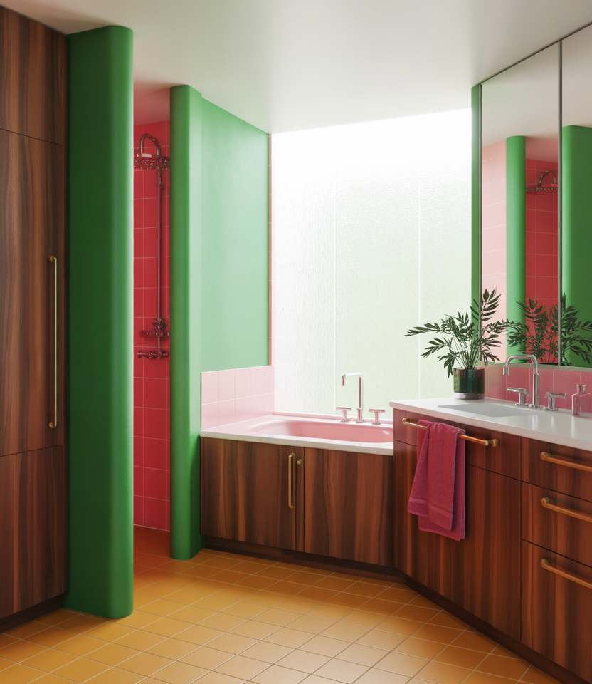 Bold color brings instant personality. Consider saturated greens, terracotta tiles, or jewel-toned cabinets. A splash of colorful intensity, refined green highlights, and a dash of pink or contrast tile anchor the scheme, creating a bathroom that energizes your morning routine. Where it works best is in spaces that lean simple architecturally—flat ceilings, basic tile layouts, or older homes with unadorned trim. The clean envelope acts as a canvas, making bold color feel intentional rather than chaotic.