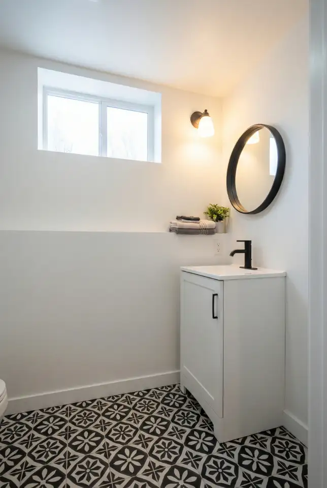 Basement bathrooms can feel flat, so giving them one bold anchor instantly helps. A basement space looks black and white, with graphic floor tiles complemented by simple white walls and matte black fixtures. Keep storage out of sight with a closed vanity, then add one framed print and a sconce to complete the look.
