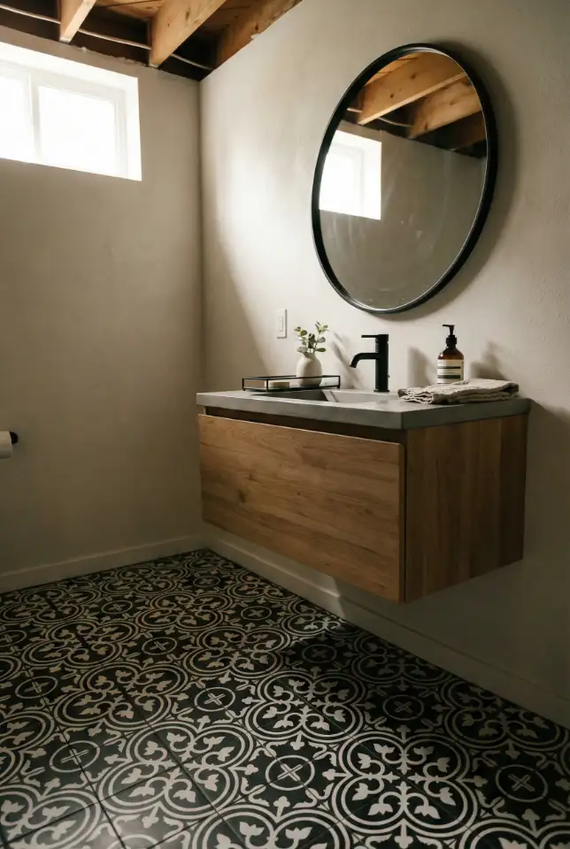 Budget/price angle: A bold tile floor gives you the biggest visual return for the least money—especially in a basement where wall space is limited. You can choose affordably patterned porcelain and keep everything else simple to avoid a costly full renovation.