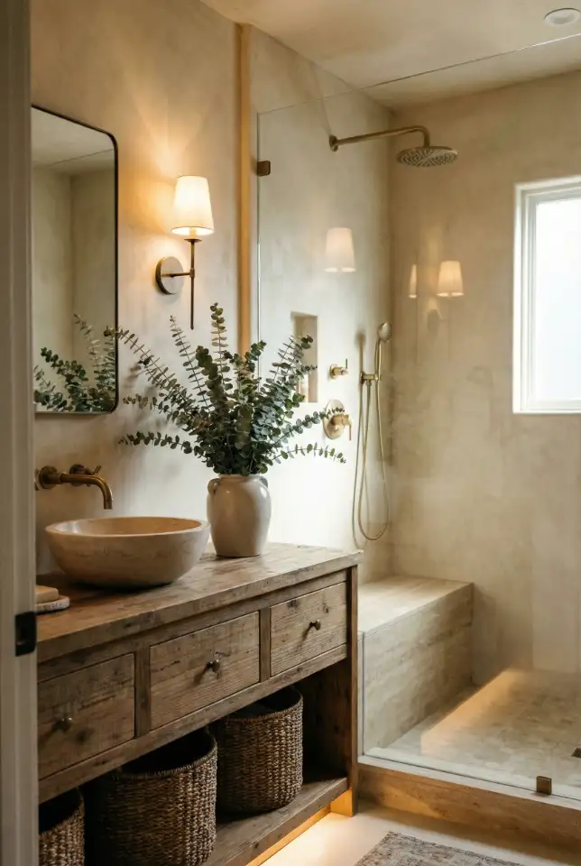 13. Rustic Ensuite With Wood Vanity And Soft Stone