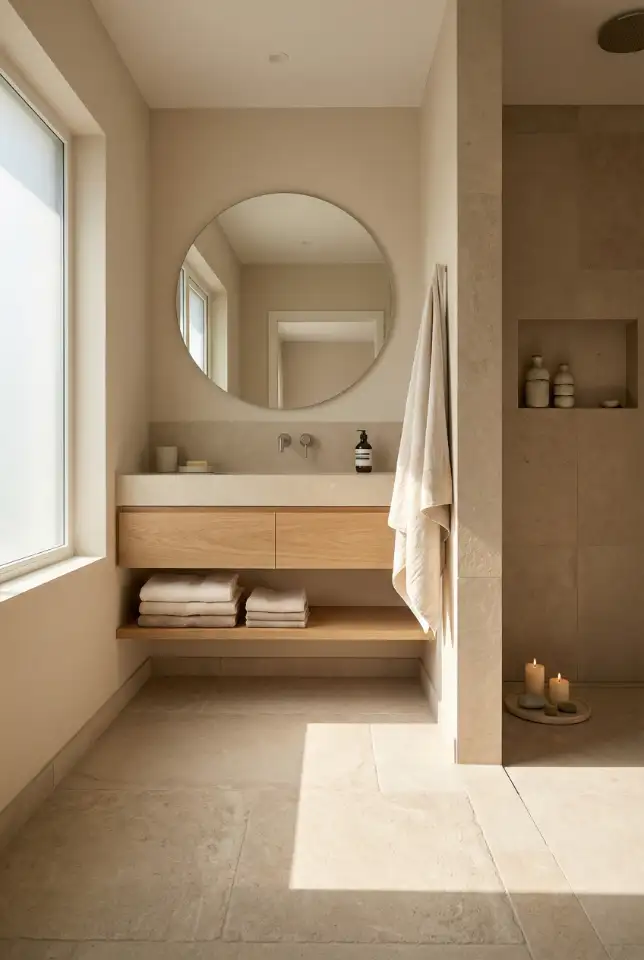 11. Beige Minimalist Bathroom With Layered Texture