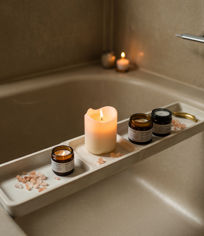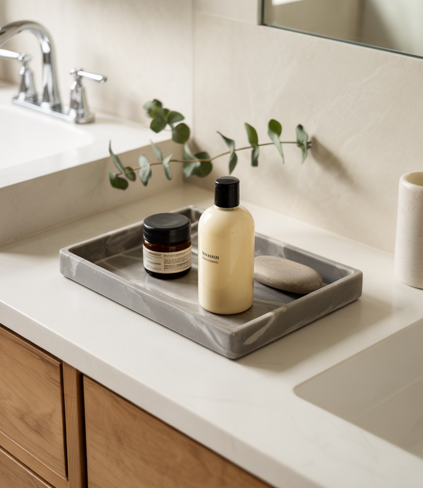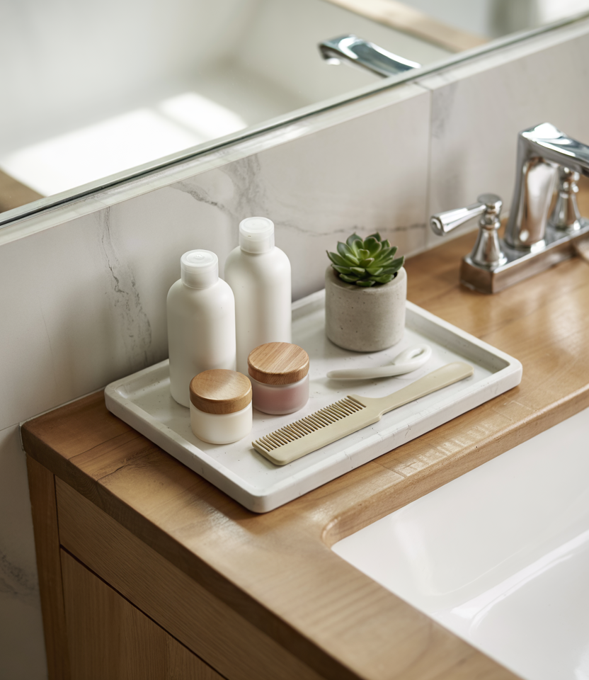 A sleek tray across the tub or vanity introduces a touch of quiet indulgence. It leans into luxury moments while keeping products gathered in one spot. Think bath salts, a candle, or a favorite cleanser arranged with intention. Even tiny bathrooms can feel like a retreat with this simple styling trick. Real homeowner behavior: people often treat spa nights as “special occasions,” but having a dedicated tray encourages more frequent mini moments of care, which subtly enhances daily routines.