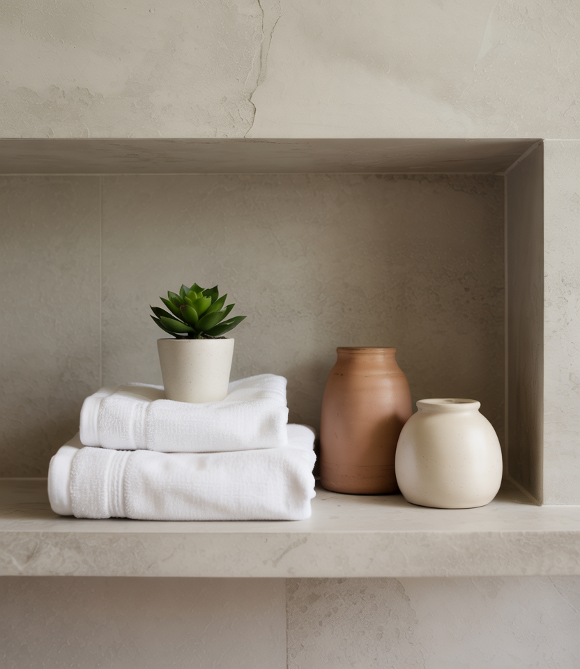 For a serene finish, embrace a clean “less is more” approach inspired by luxury spas and soft inspo boards. Limit each shelf to a few curated items—like folded towels, a plant, or uniform jars. This helps your bathroom feel intentional rather than cluttered, even if the room is small. Where it works best: minimalist homes or newly renovated bathrooms with fresh tile or stone. The clean backdrop lets the restrained styling shine, giving the whole room a spa-like presence without heavy spending.