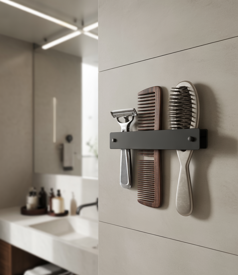 A slim magnetic strip is a clever approach to keeping grooming tools at hand without cluttering counters. It works beautifully in tight setups inspired by men’s routines or sleek hacks that make daily life easier. The strip blends into the wall and keeps metal tools—like tweezers or nail clippers—instantly visible and accessible. Practical insight: go for a strip with protective coating so tools don’t scratch the surface. Mount it near the mirror for a smooth morning flow, but far enough from water to avoid rust.