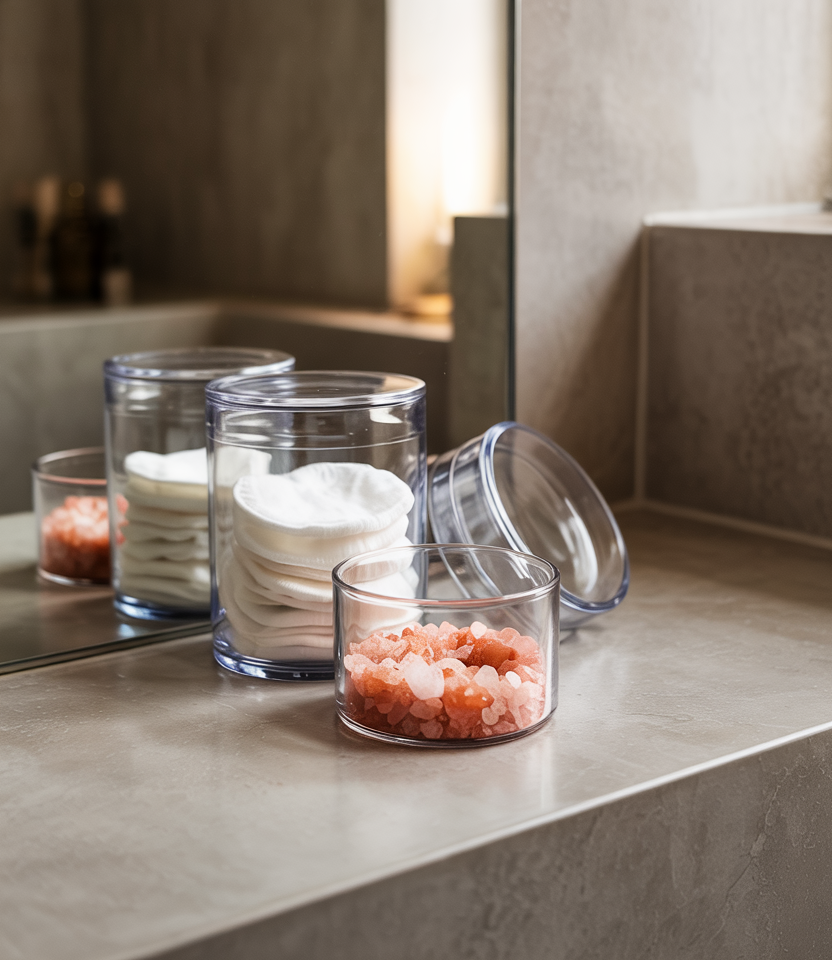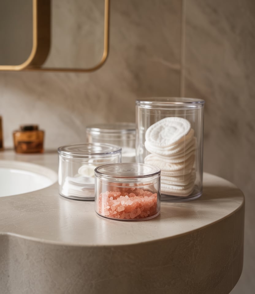 Clear canisters bring a chic, spa-like feel to the vanity, especially when inspired by aesthetic spa displays or polished countertop styling. Use them for cotton pads, bath salts, or floss picks to keep daily essentials ready while still looking refined. They offer a surprisingly high-end feel even in basic bathrooms. Micro anecdote: I once switched from a jumble of bags to two clear canisters, and the vanity instantly felt calmer. Isn’t it amazing how a simple material shift can change the energy of a whole routine?