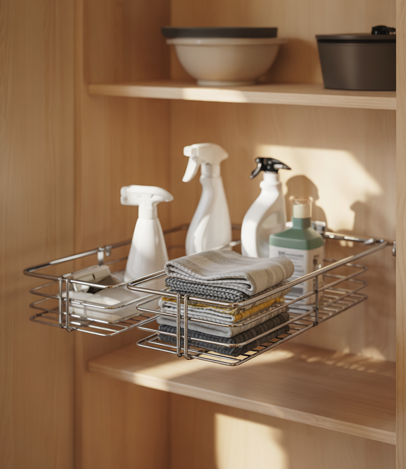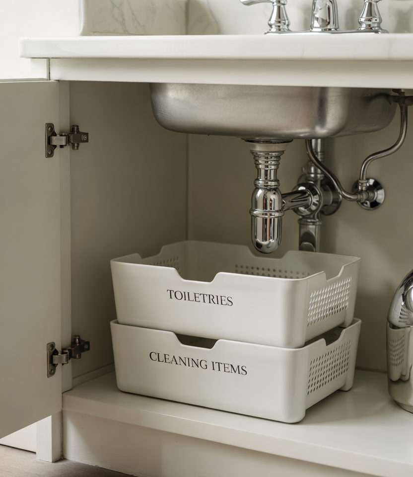 Sliding rail baskets maximize awkward cabinet depth while keeping straightforward access intact. They are one of the smartest ideas among under-sink upgrades because they glide forward, revealing everything stored at the back. Pair them with structured dividers to keep cleaning supplies or hair dryers neatly grouped. Where it works best: homes with deeper vanities, especially suburban builds where plumbing sits far back, giving room for sliding tracks that make the most of hidden space.