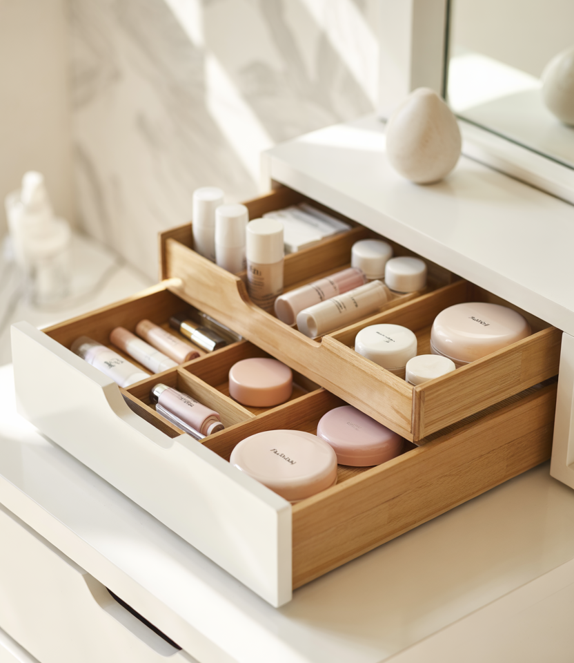 Tiered organizers can double a drawer’s capacity by stacking sections without feeling cramped. These organizers are ideal for refreshing drawers or for holding skincare minis that might otherwise roll around. The layered system keeps daily items at eye level and less-used products tucked neatly below. Expert commentary: the best tiered organizers allow the top layer to slide, offering both visibility and flexibility. It’s the closest thing to custom cabinetry without the remodel.