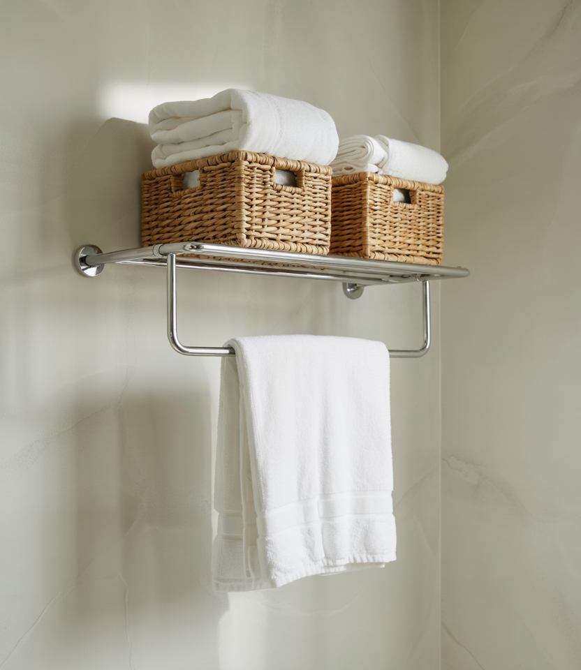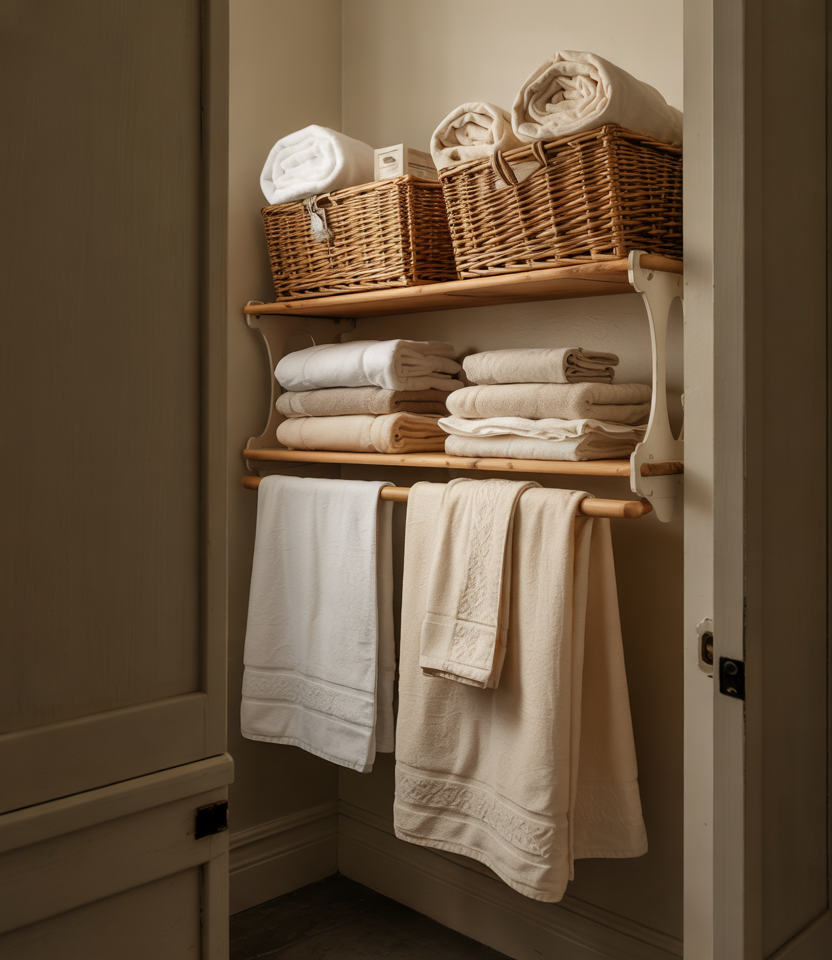 If your bathroom connects to a closet, add a slim shelf or rod just outside the door. It’s a clever crossover inspired by closet efficiency and airy inspo layouts. This station keeps fresh towels within reach while clearing space near the shower. Neutral baskets or rolled linens create a relaxing, hotel-like feel. Budget angle: instead of installing built-ins, simple wall shelves or inexpensive rods do the job beautifully. The result feels custom without the expense.
