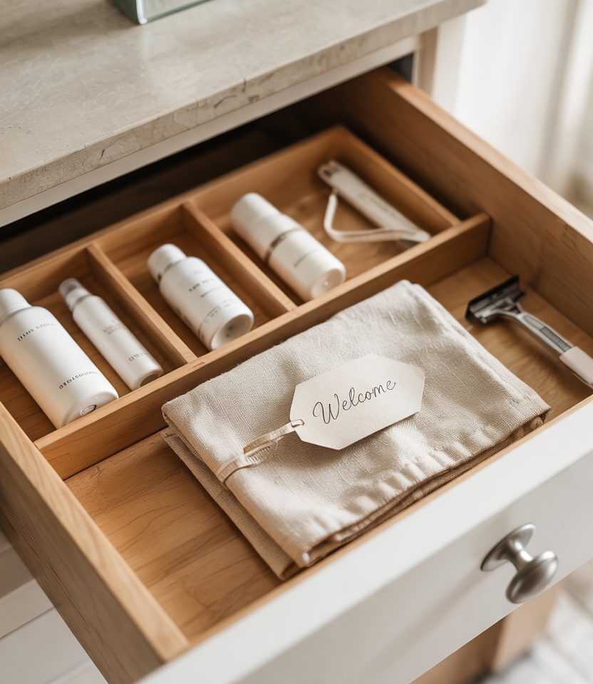 For frequent visitors, a dedicated guest drawer brings thoughtful hospitality. Style it inspired by guest checklists and tidy drawer organization trends. Stock it with travel-size toiletries, spare toothpaste, and simple grooming items. Label clearly so visitors instantly understand that the drawer is just for them. Where it works best: homes with a hall bathroom that rotates between daily use and guest use, offering quick access without interrupting household routines.