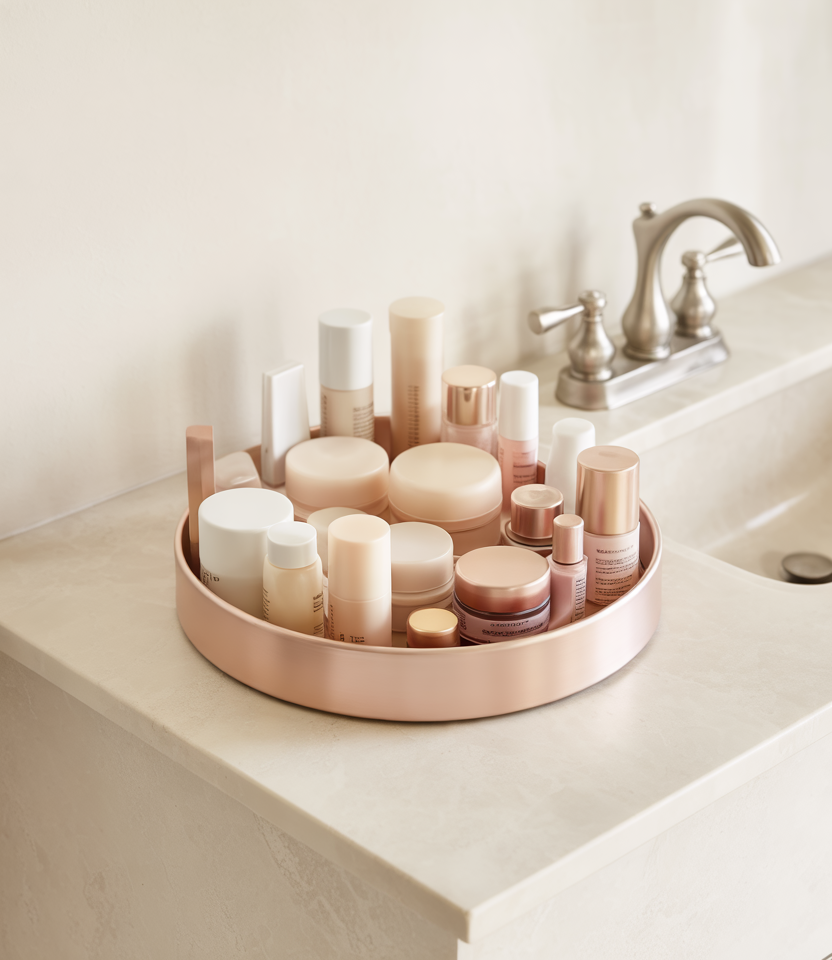 A compact Lazy Susan near the sink keeps daily essentials in easy rotation. It’s a clever nod to ideas and countertop trends and works well for curated makeup or morning skincare setups. With a quick spin, every product becomes reachable without stretching across the vanity. American lifestyle angle: with busy mornings and multi-step routines becoming the norm, a small rotating organizer adds ease without taking over the counter. It’s especially helpful for households sharing a single sink.