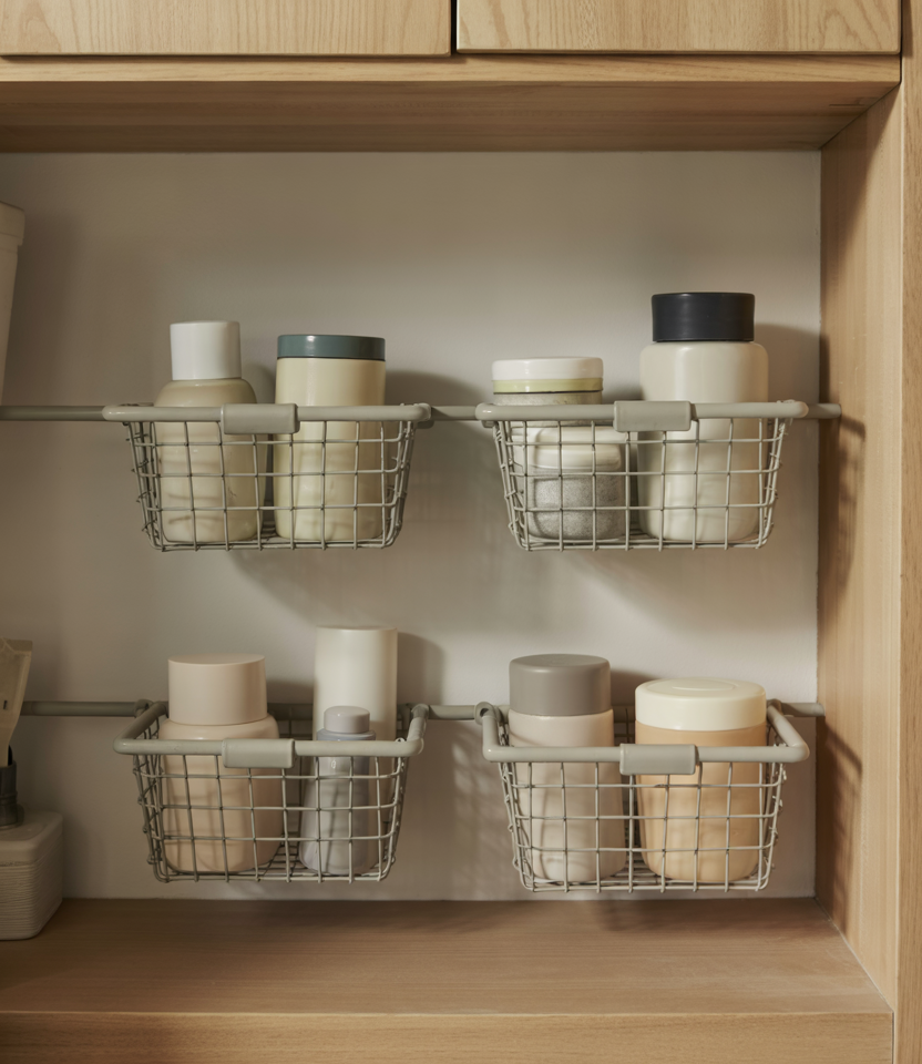 Wire baskets that clip under shelves create a bonus storage layer in cramped cabinets. They’re perfect for hacks that keep tiny items visible or for organizing ideas pulled from Pinterest boards. Slide them under existing shelves to stash cotton pads, bath bombs, or hand towels without the bulk of extra bins. Micro anecdote: a neighbor once used these for her teen kids’ bath products. All of a sudden, everyone had their own mini-section, and the nagging “Where’s my stuff?” questions vanished.