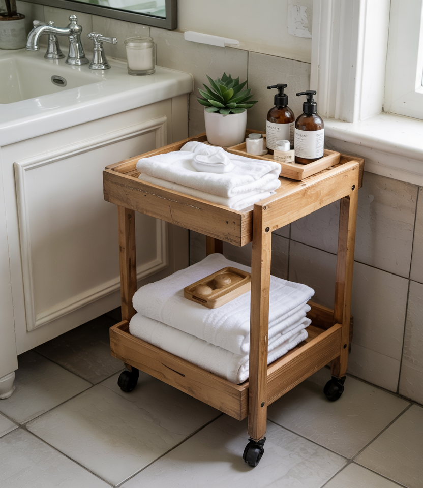 A slim rolling cart that fits beside the vanity or between fixtures brings mobile storage to tight footprints. It works wonderfully with aesthetic setups and tiny bathroom layouts when built-ins just can’t hack it. Holding everything from extra towels to skincare bottles, a two- or three-tiered cart won’t overwhelm a small room. Expert commentary: choose a cart with locking wheels so it doesn’t move around when you pull items off. Plus, metal frames hold up to humidity much better than wood, making them a long-lasting pick in bathrooms.